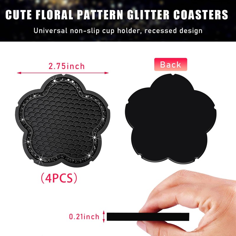 - 【Quality Materials】: These rhinestones inlaid with plum blossom shaped car coasters are made of high-quality PVC material, environmentally friendly and durable, and odorless. The material is soft and elastic. Waterproof and dust-proof, not easy to deformation. Keep your cup holder clean and tidy.