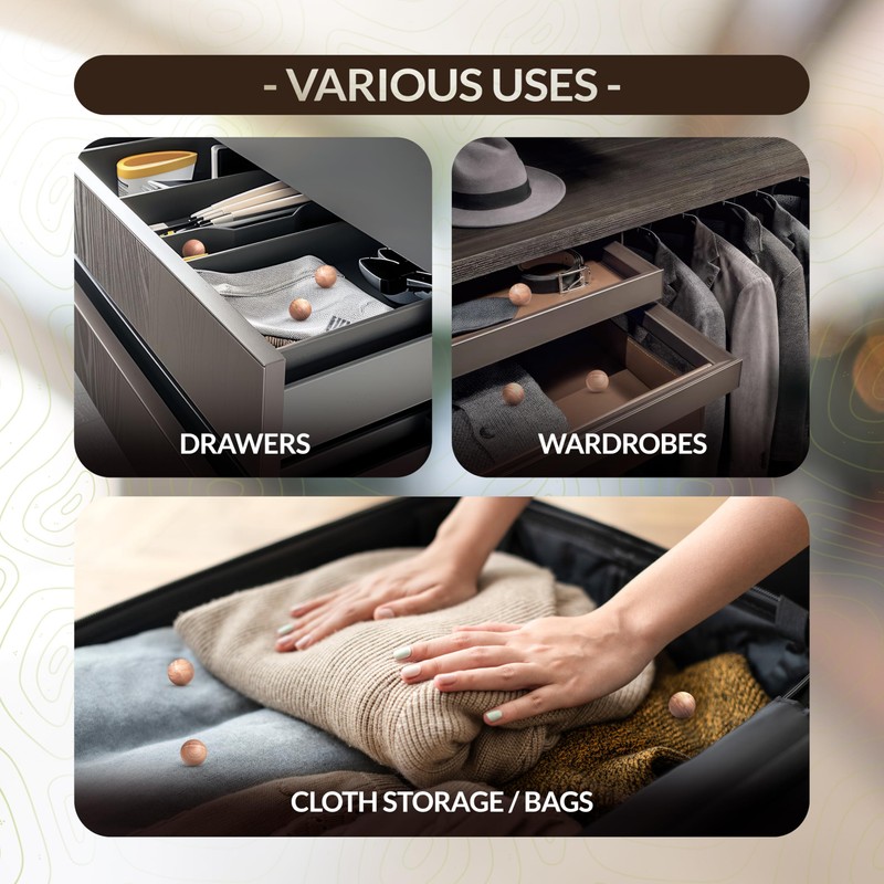 Protect your clothes with 100% natural moth balls for wardrobe! This chemical-free solution provides reliable wardrobe moth repellent by repelling moths and silverfish. Thanks to the aromatic cedar wood, the balls exude a long-lasting fragrance that not only helps against moths but also absorbs moisture to prevent mould formation.