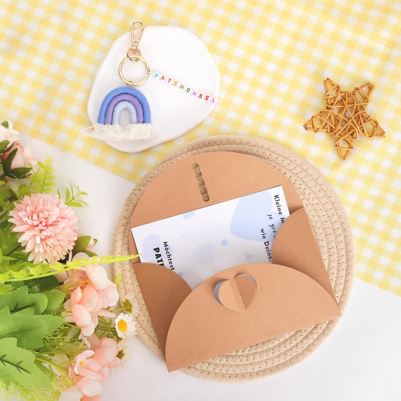 Das Set besteht aus einem liebevoll gestalteten Schlüsselanhänger und einer schönen Karte mit der herzerwärmenden Frage "Willst du meine Patenonkel sein?". Der Schlüsselanhänger ist ein dauerhaftes Symbol der besonderen Verbindung zwischen Patenkind und Patenonkel, während die Karte den perfekten Rahmen für diesen bedeutungsvollen Moment schafft.
