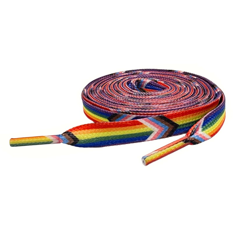 • Progress Flag Color Shoelaces: Show off your pride with our flat-styled, high-quality, woven shoelaces with a Progress pride flag design.