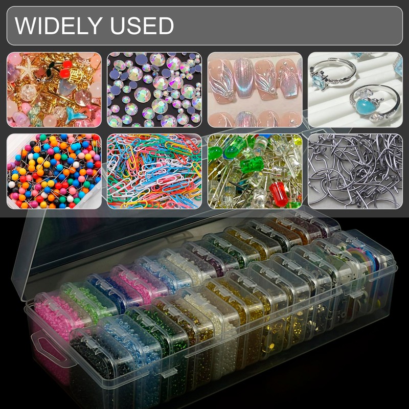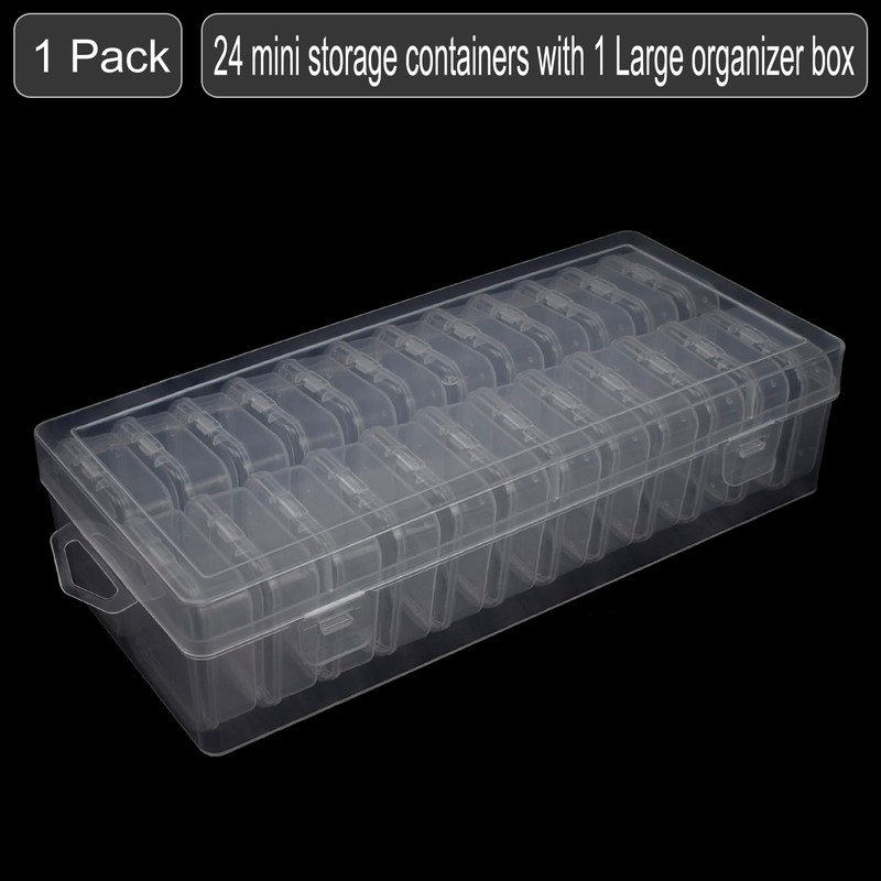 - WIDELY USED: Comes with 24 small clear plastic boxes with lids you can to perfectly organize your small items and its will help you save a lot of space and time. It is perfect for organizing and storing beads, crafts, diamonds and jewelry, diamond painting art, fake nail crafts, office supplies, electronic components, screws, seeds, earrings, buttons, pins, clasps, hair clips, stickers, coins, batteries, fish hooks, and other small parts