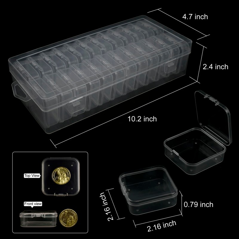 - PACKAGE INCLUDE: 1 Large transparent plastic organizer box with hinged lid and 24 mini transparent storage containers; The outer box size is 10.2" L x 4.7" W x 2.4" H; The Inner box size is 2.16" L x 2.16" W x 0.79" H