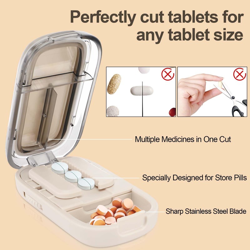 Zikenis Tablet Divider, Multiple Pill Cutter, for Small and Large Tablets, Tablet Cutter with Storage Compartment, for Travel & Pet, Daily Use (Off-White)