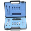 Burgess style wolf tooth extractor set with 4 sizes of oblique cut tube elevators. 2 threaded extensions add enough length to the elevators to allow the use of this instrument with a full mouth speculum in place. Molded handle attaches to all elevators and extensions.