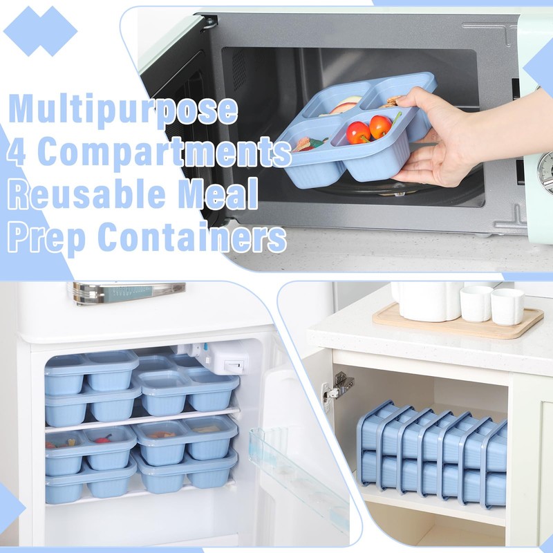 Features: Reusable and stackable design: Our 4 compartment lunch containers are not just designed for single use. They are reusable and conveniently stackable, optimizing storage space in your kitchen or lunch bag. By reusing, you also limit waste, and you can share them with your family members. Effective content organization: Avoid the messy mix up of flavors in your meals with our divided food container. The 4 compartment bento box design discourages cross flavoring, ensuring your meal stays fresh, tasty, and well organized till the last bite. However, it's recommended not to pack milk or other liquid substances for a seamless experience with these lunch storage containers. Specifications: Material: Bento boxes: wheat straw Lid: plastic Color: Bento boxes: blue Lid: clear Size: about 6.5 x 6.1 x 2.17 inches/ 16.5 x 15.5 x 5.5 cm Package includes: 12 x Bento boxes Notes: Manual measurement, please allow slight errors on size. The color may exist a slight difference due to different screen displays.