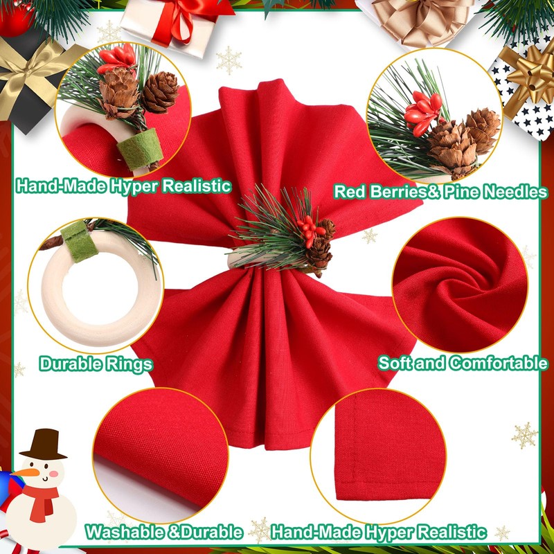 - Christmas Theme Design: our Christmas napkin rings set are designed with pine cones and faux berries Christmas elements, the dinner napkins are red and green, which fits the Christmas theme atmosphere; Xmas fabric napkins can decorate your festive table and create a nice Christmas mood and surprise your guests at the party