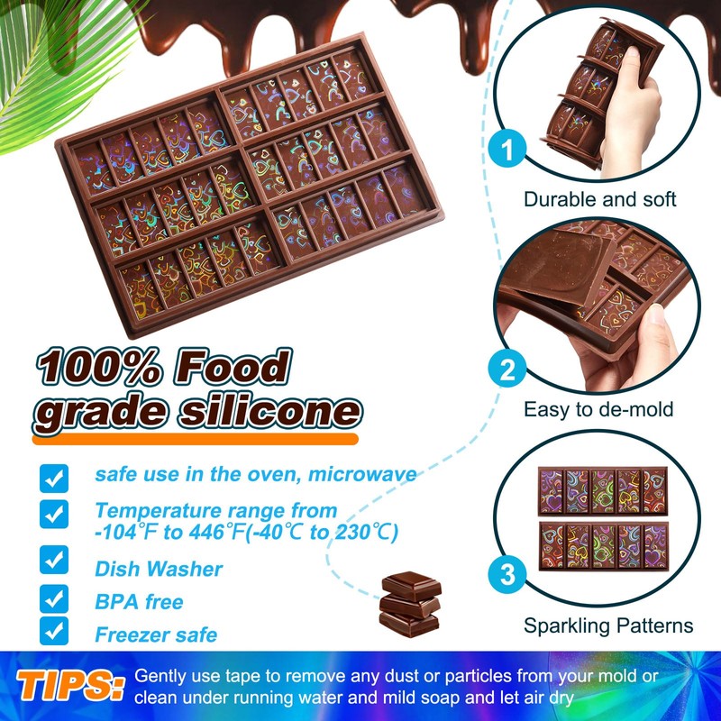 - Quality Material: our holographic chocolate mold is crafted from quality silicone material that endures daily usage without wear or tear; The flexible, nonstick surface of the silicone material allows for practicality and easy removal of the chocolates; Enjoy the experience of crafting your favorite chocolates with our mold