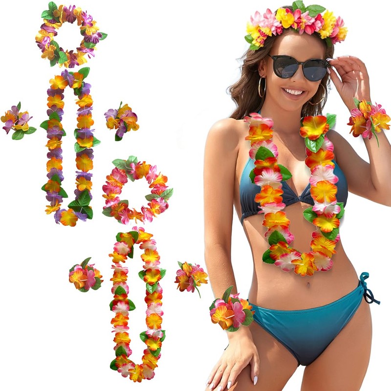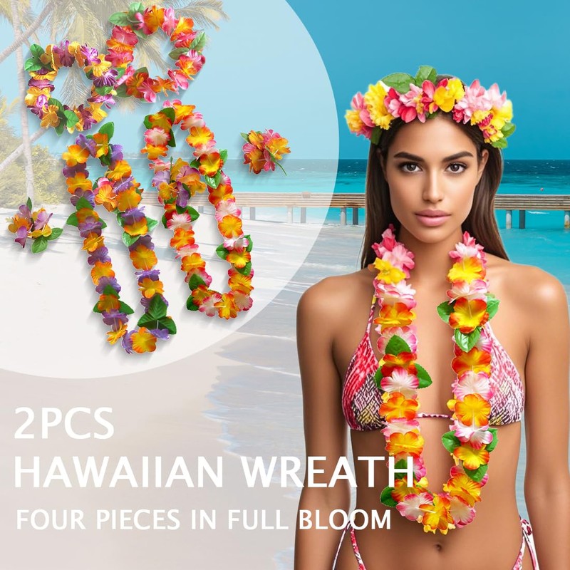 - Hawaii Kostüm Set: Enthält 2 Hawaii Ketten, 2 Stirnbänder und 4 Armbänder in zwei verschiedenen Designs