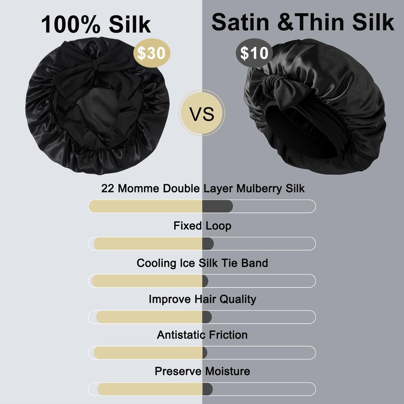 - ✅ BENEFITS OF SILK SLEEP CAPS FOR WOMEN: The perfect nighttime companion, this pure silk sleeping hair wrap is designed to protect hair from breakage and frizz and lock in your natural hair oils. 100% mulberry silk hair package has a soft, smooth touch, silk can help your skin retain moisture and reduce friction between your hair, and it can also make your hair softer. Wearing your hair overnight in a silk bonnets a natural and nourishing conditioning method.