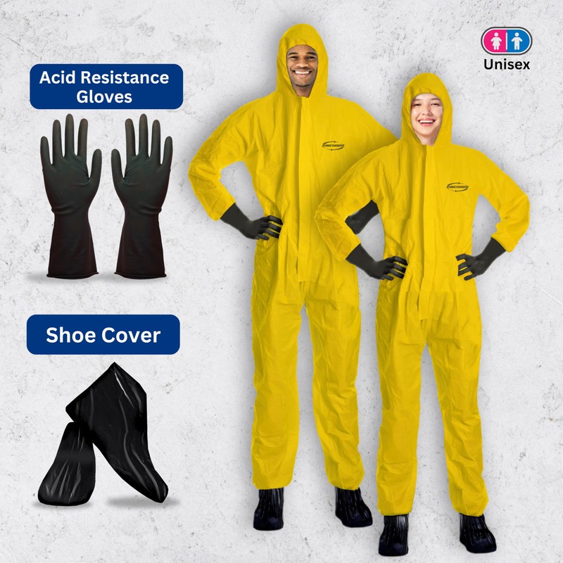 Zimchado Yellow Coverall Chemical Suit With Reusable Acid Resistant Gloves And Plastic Waterproof Shoe Cover (3X-Large)