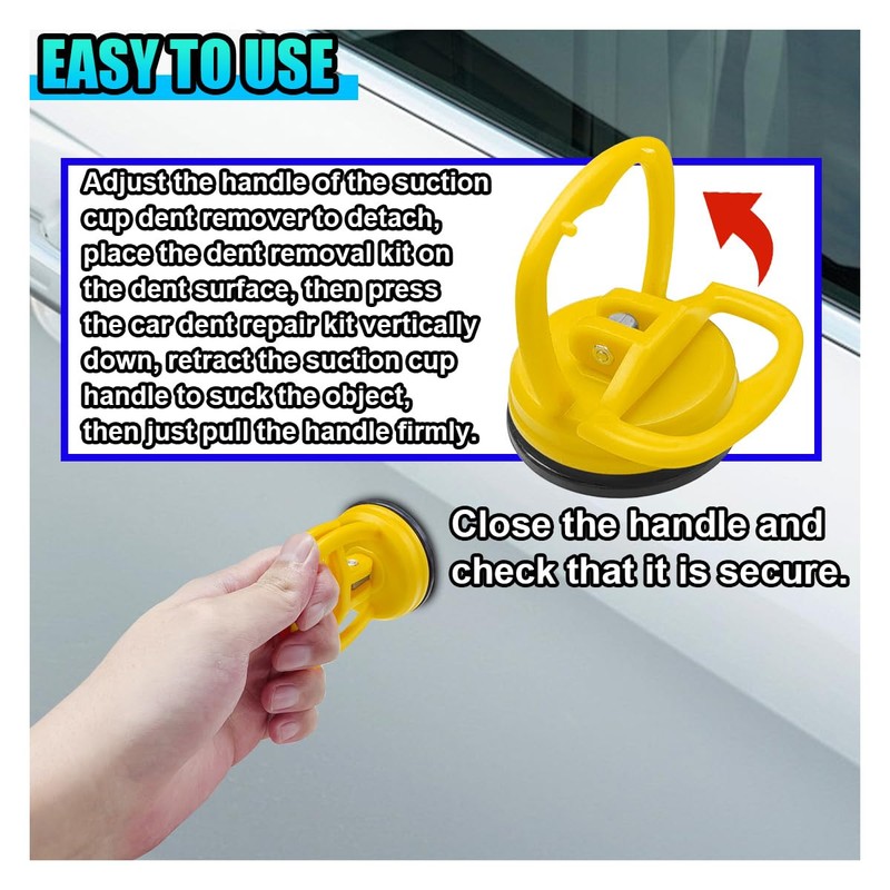 - 【Easy to Use】:This suction cup dent puller is easy to use. 1. Clean the surfaces and dent puller that need to be repaired. 2. Pour boiling hot water evenly on the surface to be repaired. 3. Align the tool with the surface to be repaired and press the pressure handle. 4. Pull out the dent puller and restore it as before.