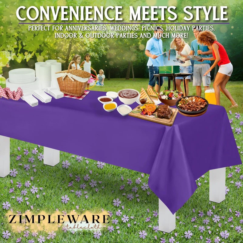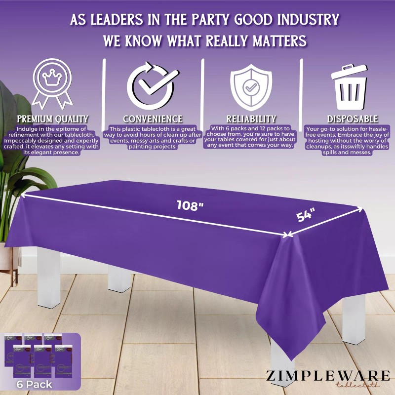 - High-Quality Material: Our Zimpleware Premium Disposable Purple Plastic Tablecloth offers the perfect blend of luxury and convenience. Made from durable fade and tear-resistant plastic, this purple plastic table cloth rectangle is designed to withstand spills and stains.
