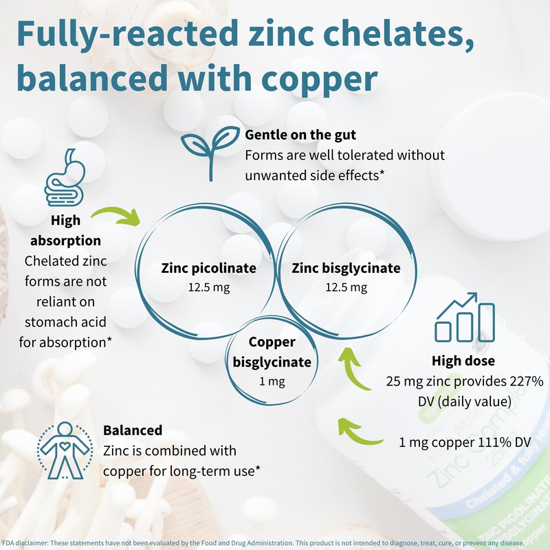 - NUTRITIONALLY BALANCED WITH COPPER: over time, zinc supplementation can reduce copper status. We deliver 25mg pure elemental zinc, balanced with chelated copper bisglycinate for safe, long-term use