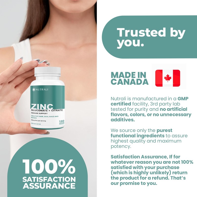 - We offer a satisfaction guarantee: If you're not completely satisfied, we'll refund your money. Incorporate Our Certified Organic Zinc Gluconate and Zinc Citrate Supplements into your daily routine to potentially support mental clarity, heart health, antioxidants, enhanced energy, and more. Our goal is to make the purest, all-natural, healthiest products on earth.