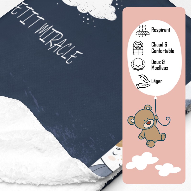 Give the perfect gift for a new arrival with our baby blanket accompanied by a microfiber gift pouch. Presented in a stylish and practical way, this pouch adds a touch of sophistication to your gift and makes it easy to carry during baby celebrations or baby showers.