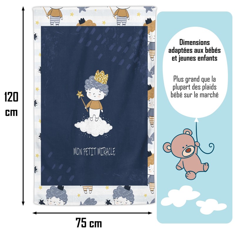 Whether for cuddling moments in the cot or comforting naps on the baby play mat or strolling in a stroller in cool weather, our blanket meets all the needs of your little treasure. With its generous size of 120 x 75 cm, it ensures long-lasting comfort, adapted to every stage of your baby's growth.