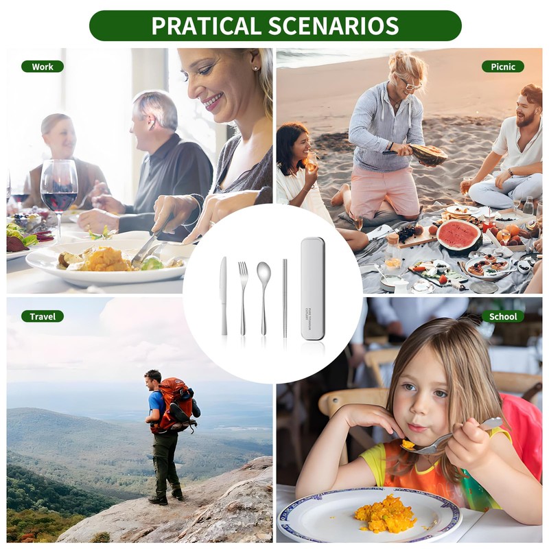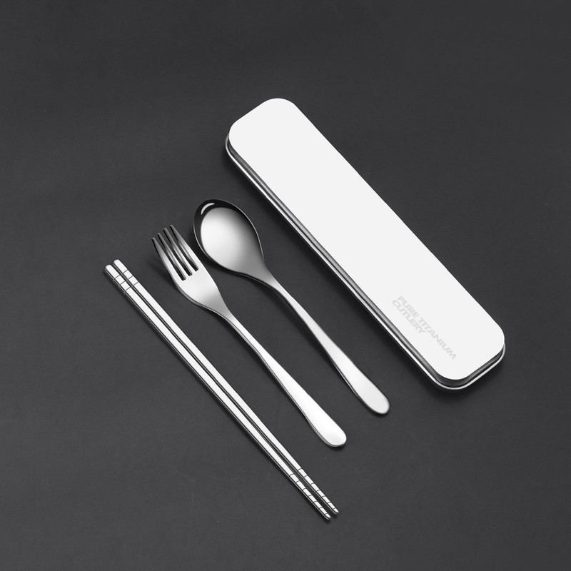 - What do you get? : Zing tti 4-piece set of titanium tableware with box: including 1x Titanium Chopsticks, 1x Titanium Knife, 1x Titanium Fork, 1x Titanium Spoon, and 1x stainless steel travel tableware suitcase, ... Applicable to restaurants, travel, camps, schools or workplaces...