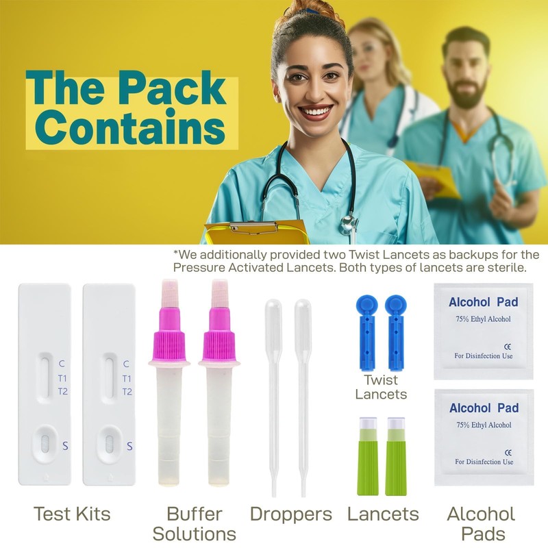 - All-Inclusive Kit: Contains 2 test cassettes, sterile lancets, dropper, buffer solution, and illustrated instructions for seamless testing.