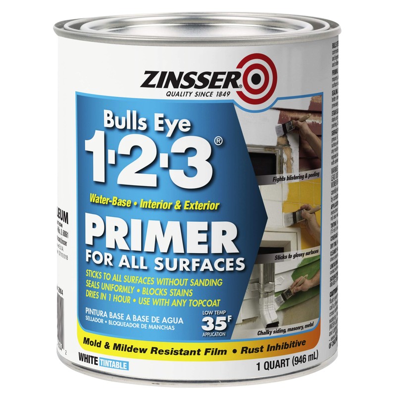 The Zinsser Bulls Eye 1-2-3 Water-Based White Interior/Exterior Primer and Sealer can be used on a variety of surfaces throughout the whole house. It adheres well to glossy surfaces, including tile and enameled trim. The primer inhibits rust on new metal and is ideal for application on alkaline surfaces. The finish seals tannin bleed and resists mold and mildew growth. Its breathable, flexible finish resists blistering and peeling