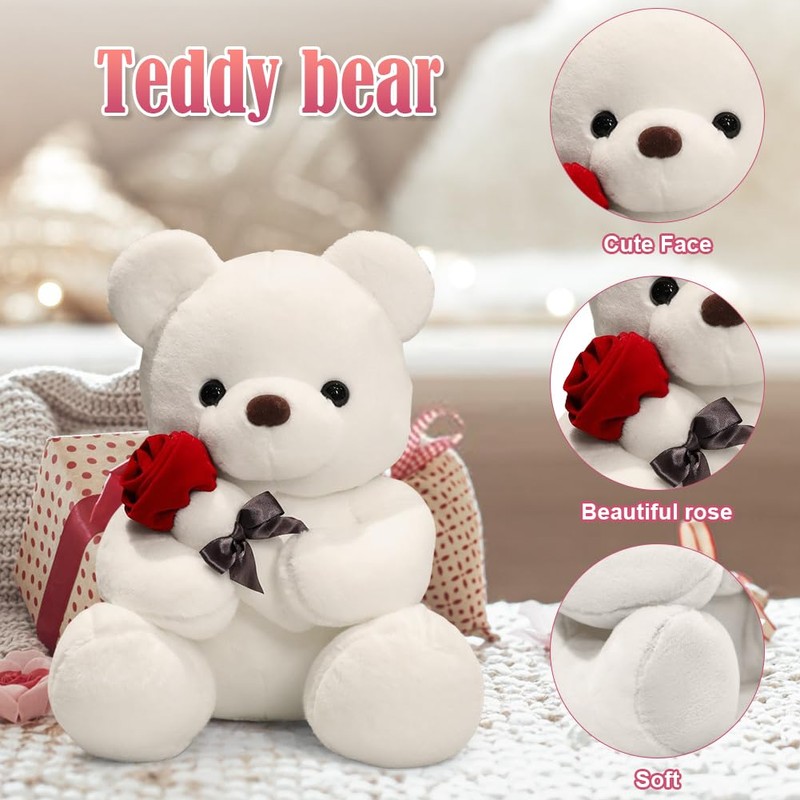 Zinueen Rose Teddy Bear 23 cm, Cuddly Toy, Plush Teddy Bear, Valentine's Day Gift for Girlfriend, Soft Plush Bears for Gift, Girlfriend, Christmas, Birthday (White)
