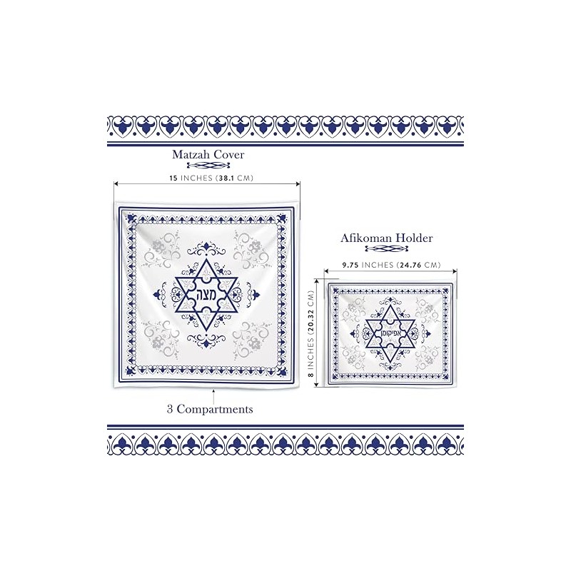 - Elegant Matzah Cover Set - The Matzahs cover set includes a 15" square silk Matzah Cover with three pockets for the traditional 3 Matzot and a matching Afikoman Holder (10.25" x 7.75").