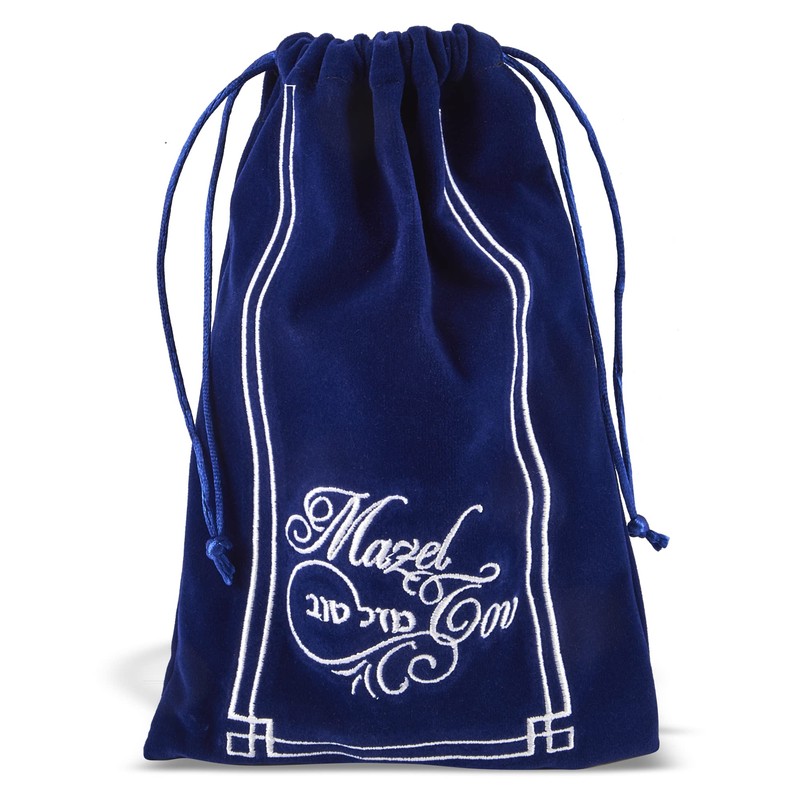 - The Bridal Bag - Comes in 2 elegant fabric options, a lush dark-royal-blue velvet with silver embroidery or an off-white/cream suede with Champagne color embroidery. The embroidered design spells out “מזל טוב” in Hebrew and "Mazel Tov" in English. In addition to this bag we also include an outer clear zip-lock bag to protect the embroidered bag from getting stained while being stepped on.