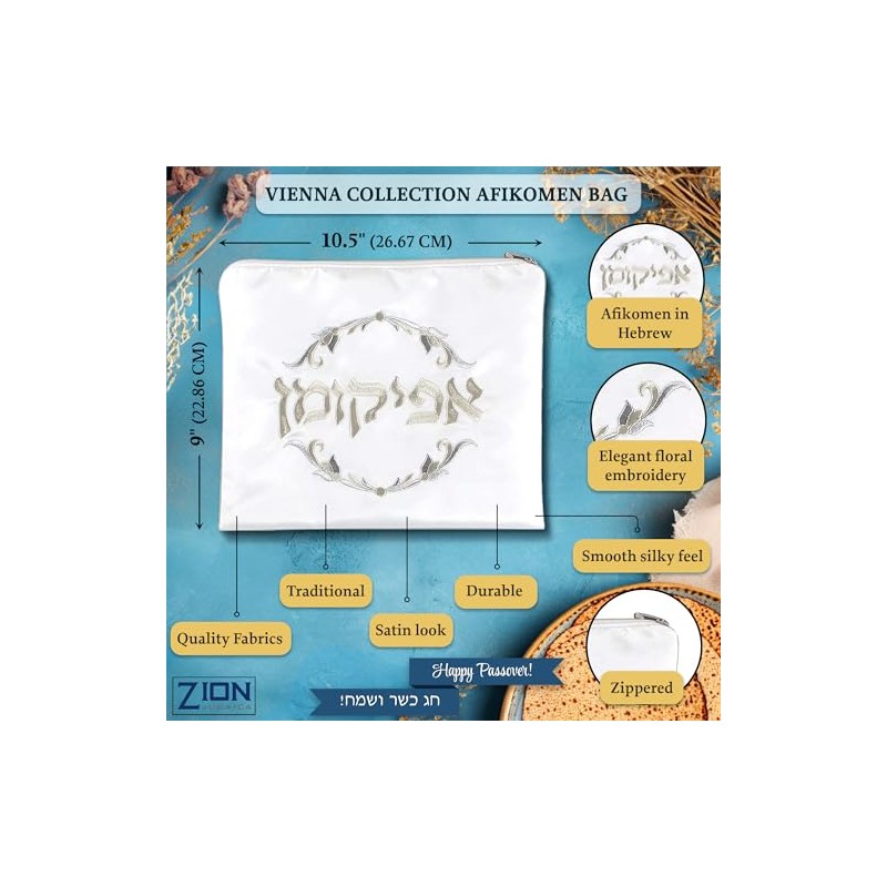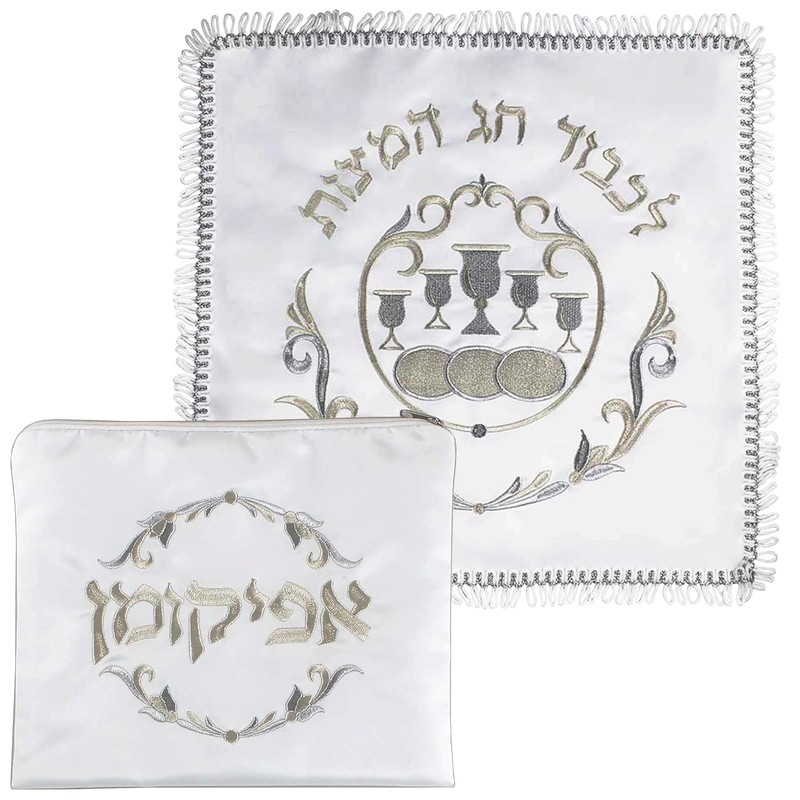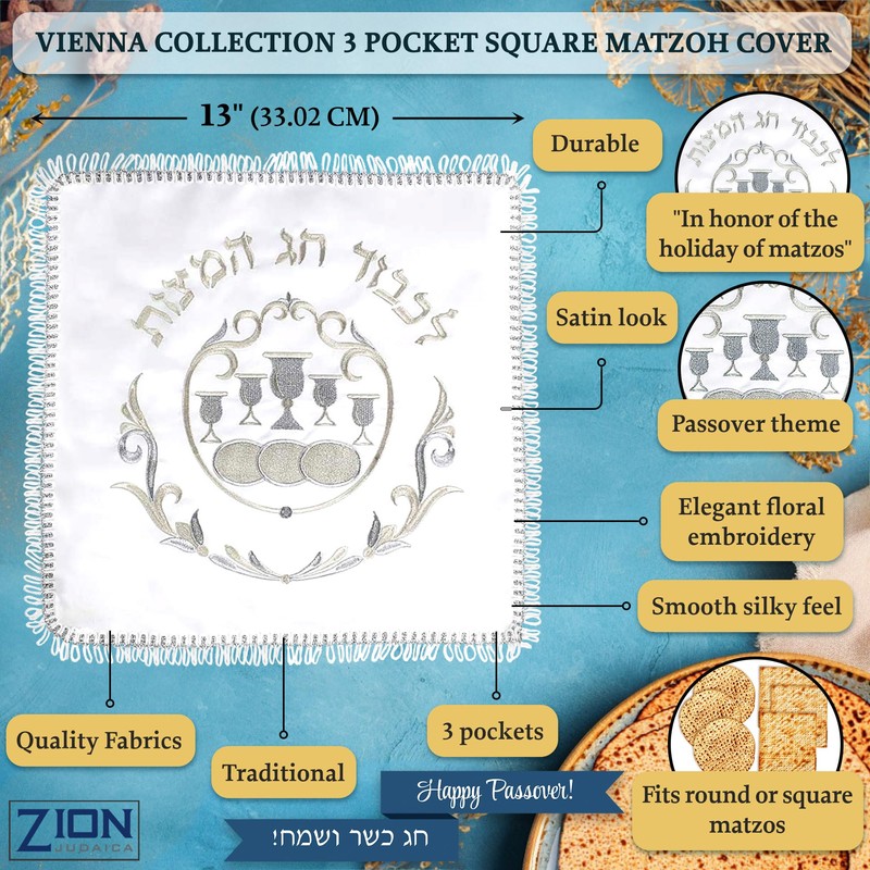 • Smooth Silk feel Designed with class in 2-tone silver colors the Matzah cover comes embroidered with the words in hebrew "לכבוד חג המצות" which translate to In honor of the holiday of matzos, and features four cups of wine and 3 Matzot with an elegant floral pattern.