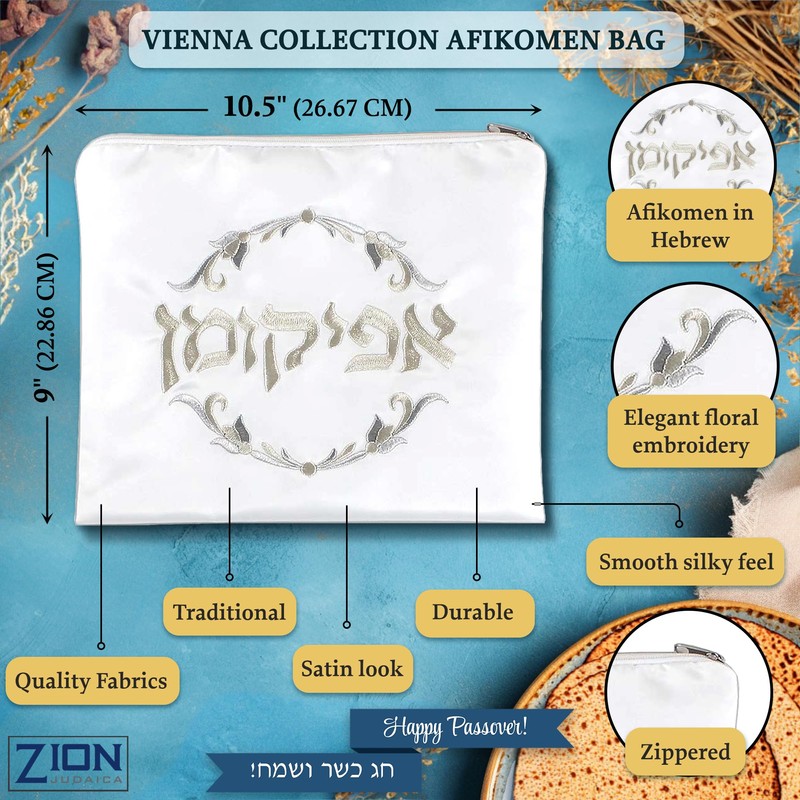 Zion Judaica Passover Seder Square Matzah Holder and Afikoman Holder 13" x 13" Square Satin Matzo Cover with 3 Pockets for 3 Matzot 10" Zippered Afikomen Bag Silk Vienna Passover Collection