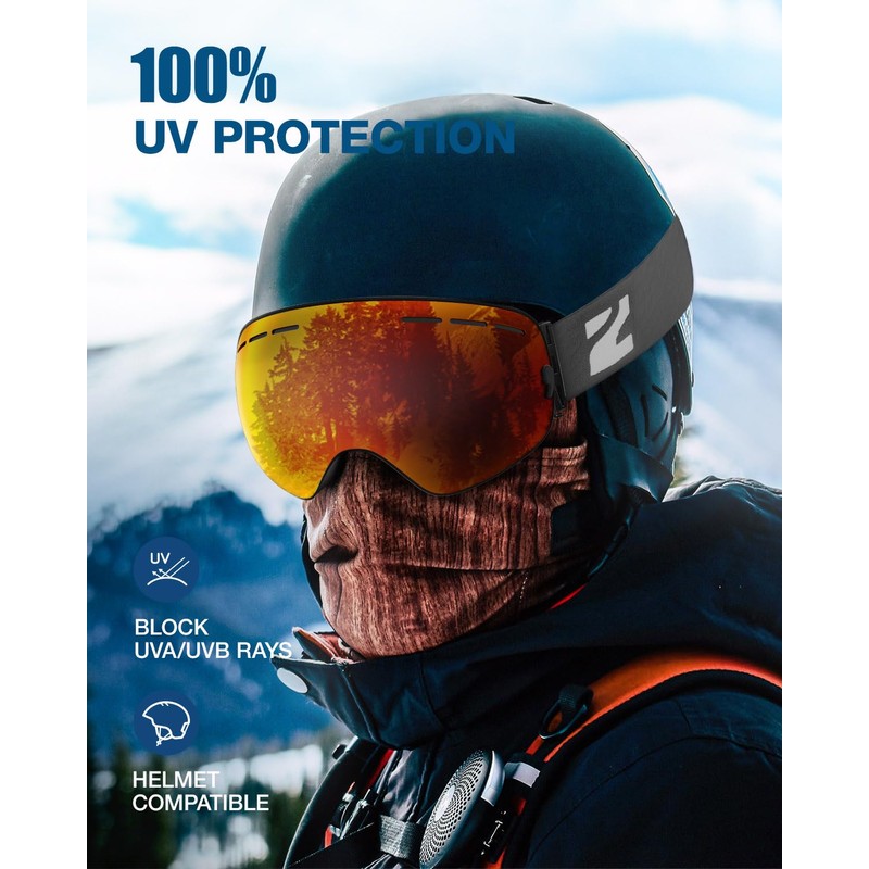 ZIONOR X Ski Snowboard Snow Goggles OTG Design for Men Women Adult with Spherical Detachable Lens UV Protection Anti-fog (VLT 21% Black Frame Revo Red Lens)