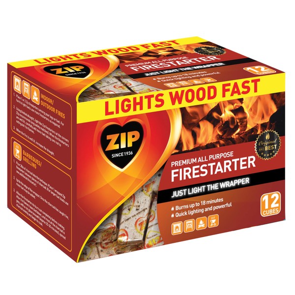 ZIP All Purpose for Outdoor and Indoor Long Burn Time Instant Light Fire Starter Ideal for Barbecue, Grilling, Camping, Hunting, Fishing, Tailgating, Firepits, Fireplace, Stove, Bonfires, Heating 12pk