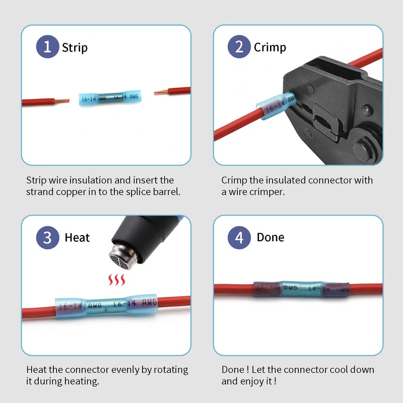 - 3:1 Shrink Ratio: Marine grade heat shrink tubing provides high tensile strength and enough hot melt adhesive inside the tubing to ensure waterproof performance, your wires will never slip out of the wire splice connectors.