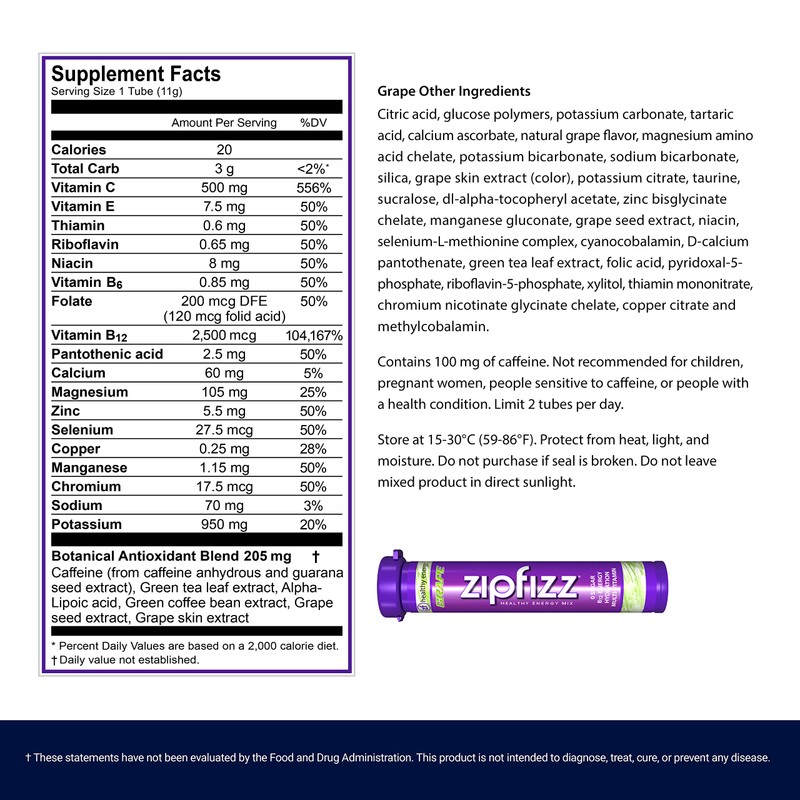 Zipfizz Healthy Energy Drink Mix, Hydration with B12 and Multi Vitamins, Grape, 20 Count