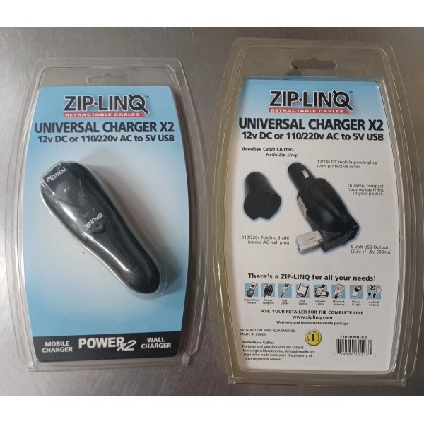 Zip-Linq's revolutionary Power Times 2 combination AC and DC power adapter allows you to easily adapt all your Zip-linq retractable charging cables to work from any 12V mobile or 110VAC outlets. This compact and lightweight adapter rapidly charges NI-Cd, Ni-Mh and Li-Lon batteries. Perfect for use with Mobile phones, PDA or any other device that can be charge from a USB port.