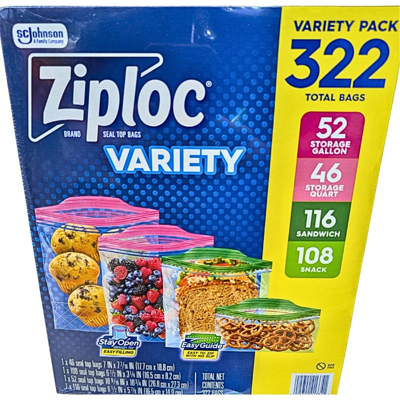 Ziploc Seal Top Bags Variety Pack Gallon Quart Sandwich Snack Sizes 322 Count