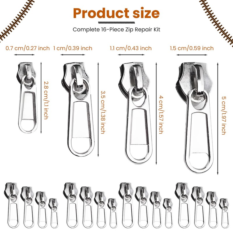 - Complete 16-Piece Zip Repair Kit Includes 16 silver zip pull replacements in four UK standard sizes: #3, #5, #8 and #10 (4 pieces each). A handy solution for fixing broken zips on coats, trousers, backpacks, and luggage.