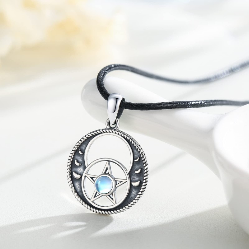 - Moon phase necklace: This necklace shows a moon phase combined with a pentagram and is decorated with a synthetic moonstone design, the crescent moon combined with the pentacle element mysterious, elegant and charming. This pentagram necklace design concept comes from a phrase: "The moon is round, like a spinning wheel, turns their romantic dream".