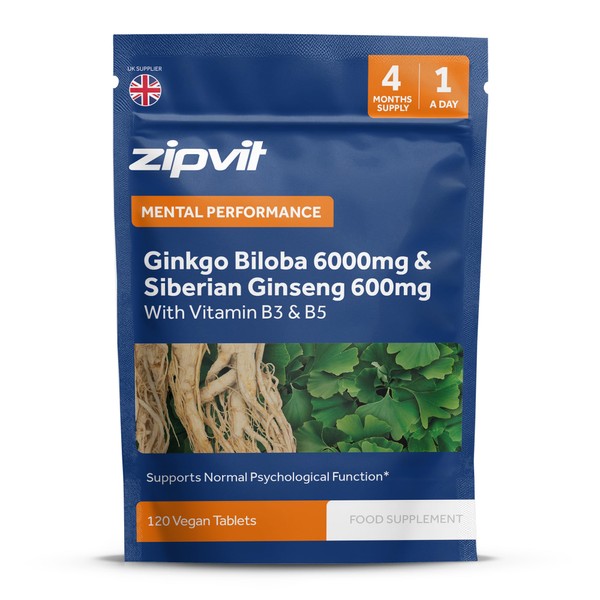 Zipvit Ginkgo Biloba 6000mg & Siberian Ginseng 600mg with Vitamins B3 & B5 Pouch, 120 Vegan Tablets, Supports Energy & Mental Performance, 4 Month Supply