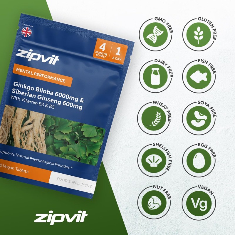 Zipvit Zipvit Ginkgo Biloba 6000mg & Siberian Ginseng 600mg with Vitamins B3 & B5, 120 Vegan Tablets, Supports Energy & Mental Performance, 4 Month Supply