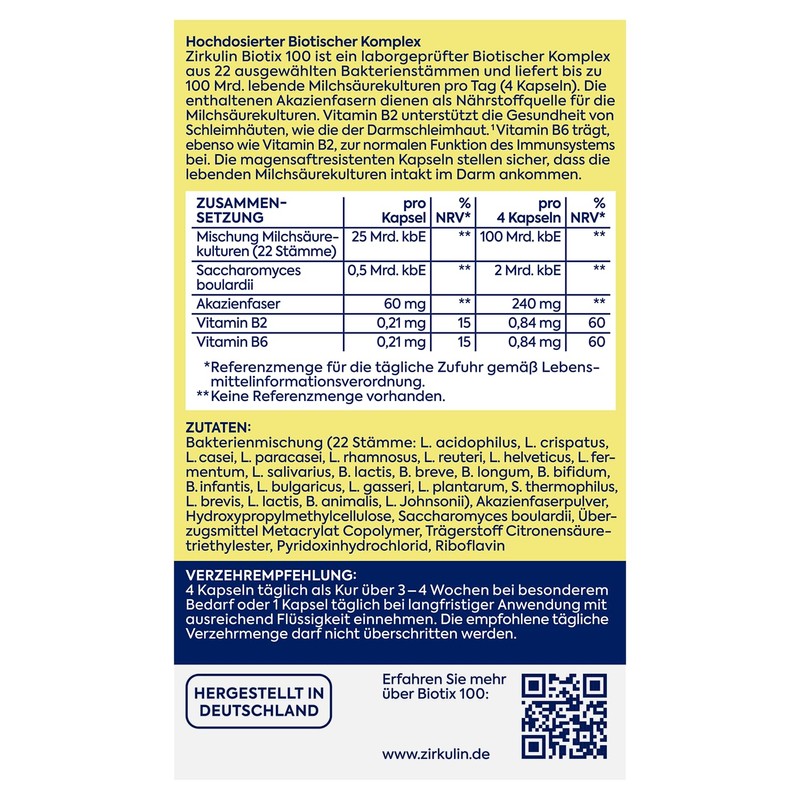- Vitamin-B-Boost für Darmgesundheit und Immunsystem: Zirkulin Biotix 100 enthält Vitamin B2, das zum Erhalt normaler (Darm-)Schleimhäute beiträgt, sowie Vitamin B6, das die Funktion des Immunsystems unterstützt.
