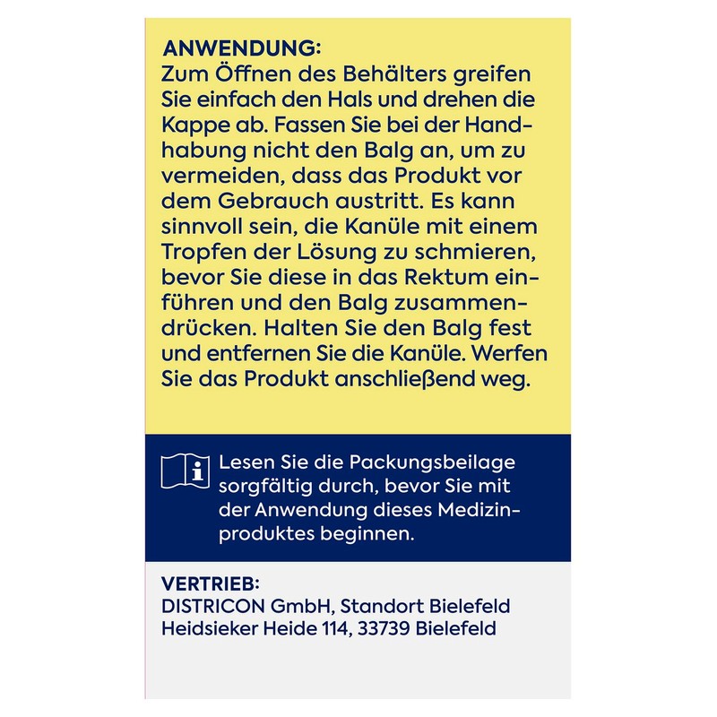 - Rein lokale Wirkung – Der Darm wird durch die lokale Wirkung bei Anwendung der Mikroklistiere insgesamt nicht belastet. Die Lösung zur rektalen Anwendung ist frei von Konservierungsstoffen.