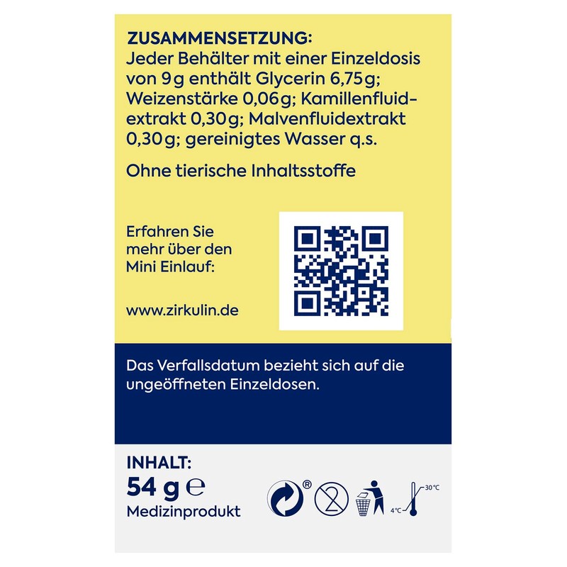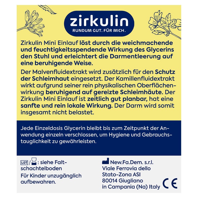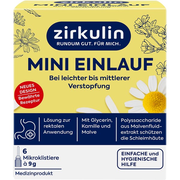 - Lieferumfang – Zirkulin Mini-Einlauf zur rektalen Anwendung, Lösung von Darmverstopfung mit Glycerin, Kamille und Malve, 6 Mini-Klistiere à 9 g, insg. 54 g