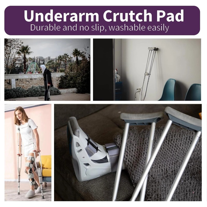 Materia & Function The crutch pads are made of high quality, high density foam that effectively provides cushioning and evenly distributes crutch pad helps distribute weight evenly and prevents chafing or irritation from prolonged crutch use. The crutches pads wick away moisture, which is especially beneficial for those who may sweat or feel uncomfortable during prolonged use.Keeps skin dry. The surface of the crutch padding is made of a non-slip material to prevent the hands from sliding during use. Enhanced grip and stability reduces the risk of accidents or falls. Features Extra thick cushion Washable Reusable Soft and breathable Anti-skid buffer Reduce wear and chafing 100% satisfied If you have any disappointing parts, the after-sale team will solve your problem and provide satisfactory service within 24 HOURS.
