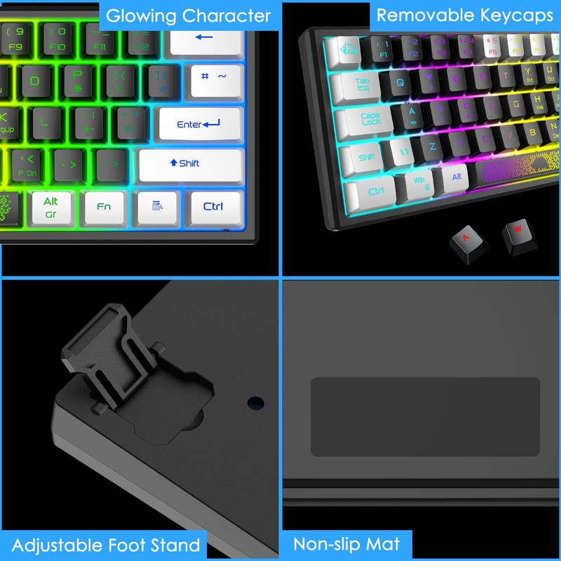 - 【Anti-ghosting Function】This mini 62 key gaming keyboard’s keycap is made with rubber oil, laser carving and double shot injection technology, can create a mechanical feel with low sound when clicking, luminous characters, no need to worry about wear-out, removable keycaps, easy to clean or replace, it support 19 key non conflict and has a radiant space bar and a unique logo key(which is ESC key, press FN+Logo key can realize ESC key function), along with a standard bottom row layout.