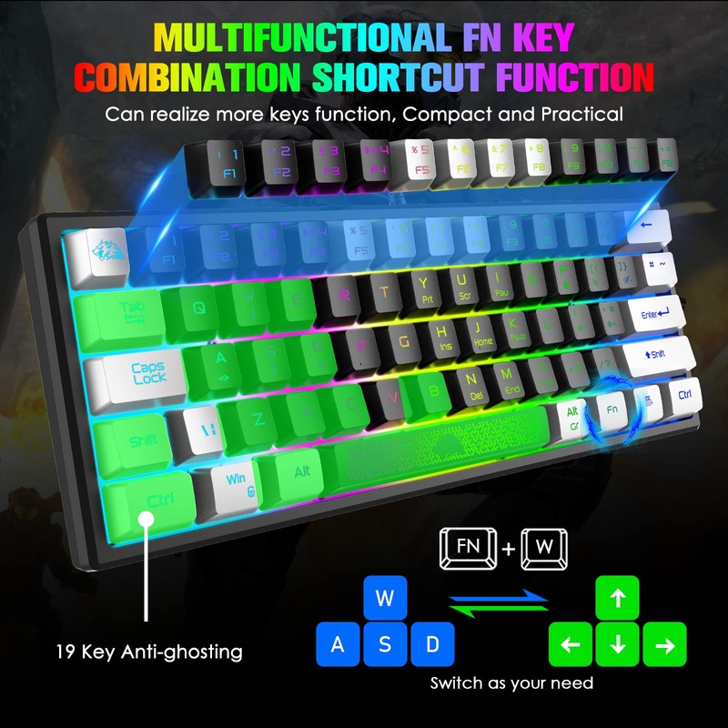 - 【Multi RGB Backlight Color and Mode】This compact gaming keyboard is equipped with premier built-in RGB LED, which can offer 7 kinds of chroma backlight effect and 8 different color for your choice, and you also can adjust backlight brightness and breathing speed by pressing FN+related key according to your real needs, providing a immersive lighting show when in dark place, effectively enhance the competitive atmosphere when gaming.