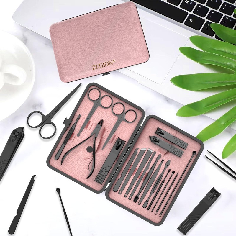 ZIZZON Nail Clippers Manicure Pedicure Set 18 in 1 Nail Grooming Kit with Leather Travel Case(Black/Pink)