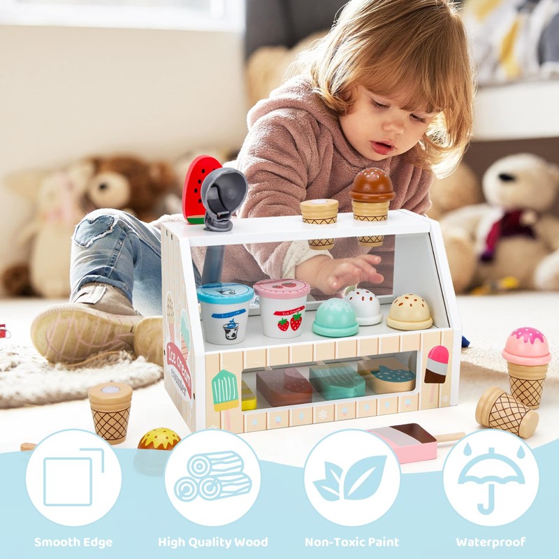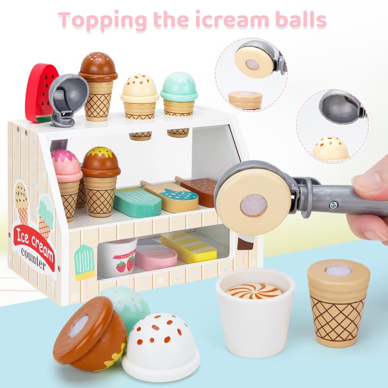 - Ice Cream Counter Shop: Includes all the accessories kids need to run the store, engage children in stacking ice creams, changing toppings, and pretending to serve customers. Matching menus and cash provide a more realistic experience for kids.