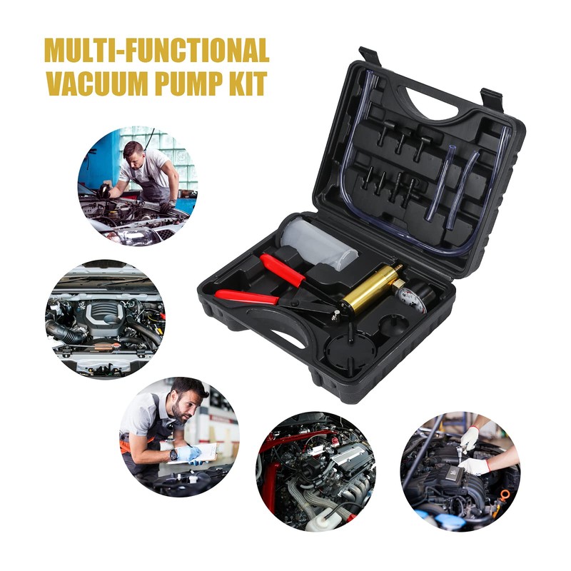 - Versatile: Hand vacuum pump kit comes with a vacuum gauge to help you take accurate readings. Pressure range: 0-30 inches Hg, 0-760 mmHg. It includes accessories for brake bleeding and automotive diagnostics. The vacuum pump kit can test and diagnose a variety of parts and general systems on bikes motorcycles trucks pickups or any other vehicle.