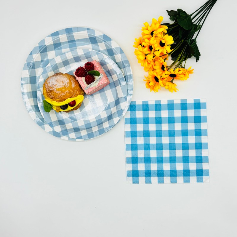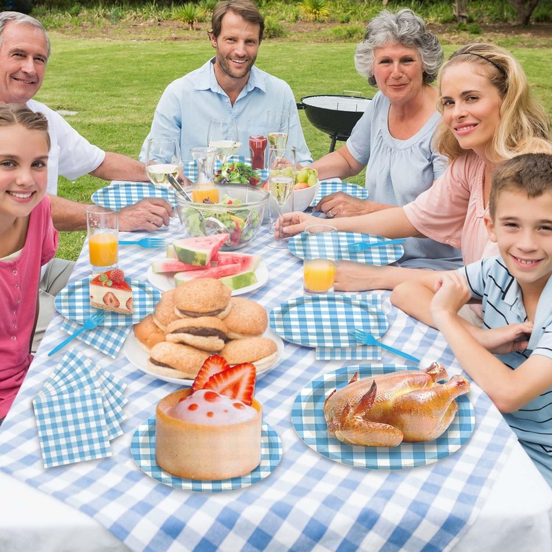 - 💙 Classic Blue & White Design: Featuring a charming blue and white gingham pattern, these plates and napkins bring a fresh and classic look to your table setting.