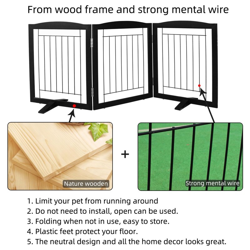 ZJSF Freestanding Dog Fence Indoor, Foldable Dog Gate for Doorways, Stairs or Hallways, Sturdy Wood Extra Wide Pet Gate with Support Feet for The House, Black, 24 "Height-3 Panels