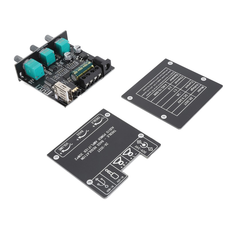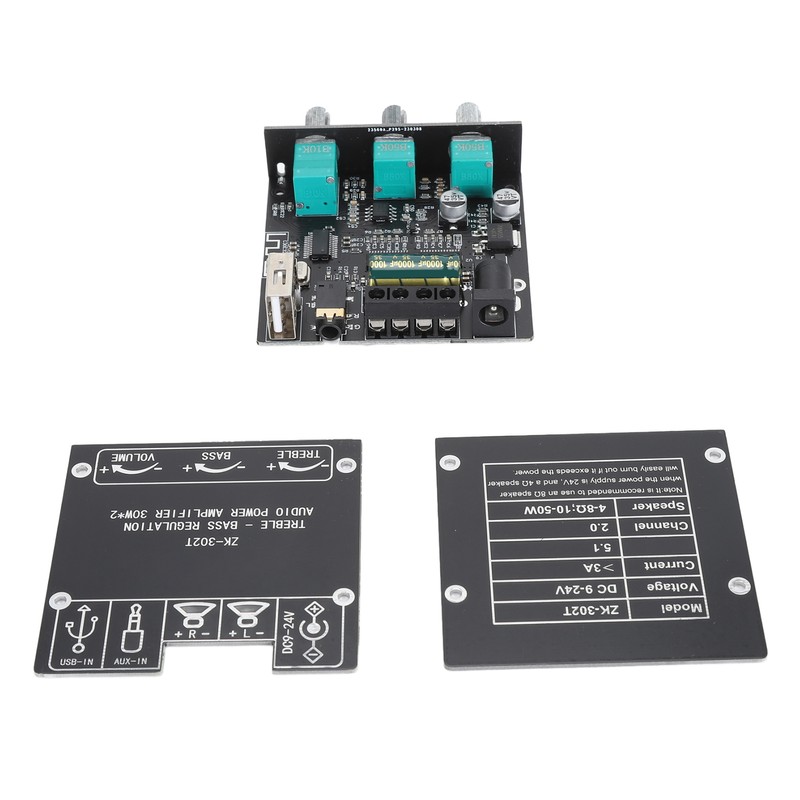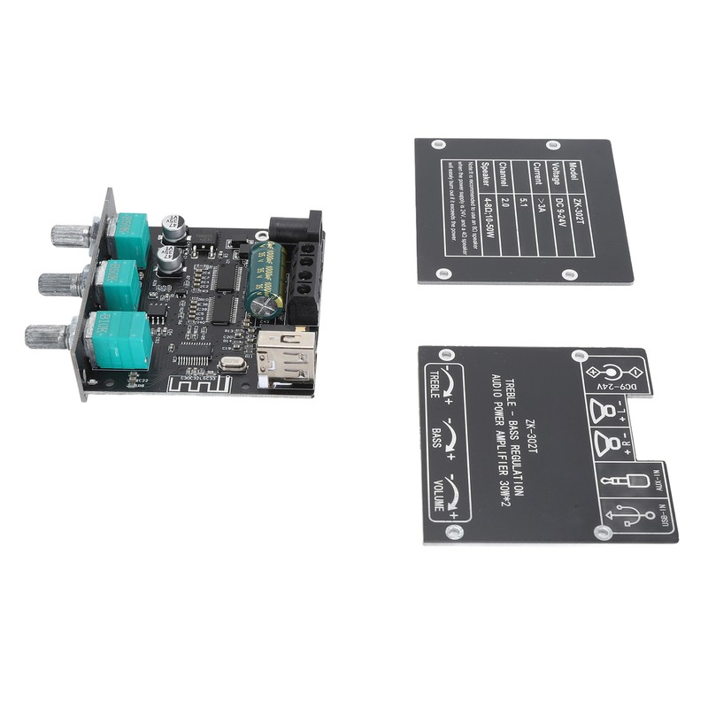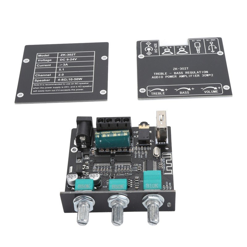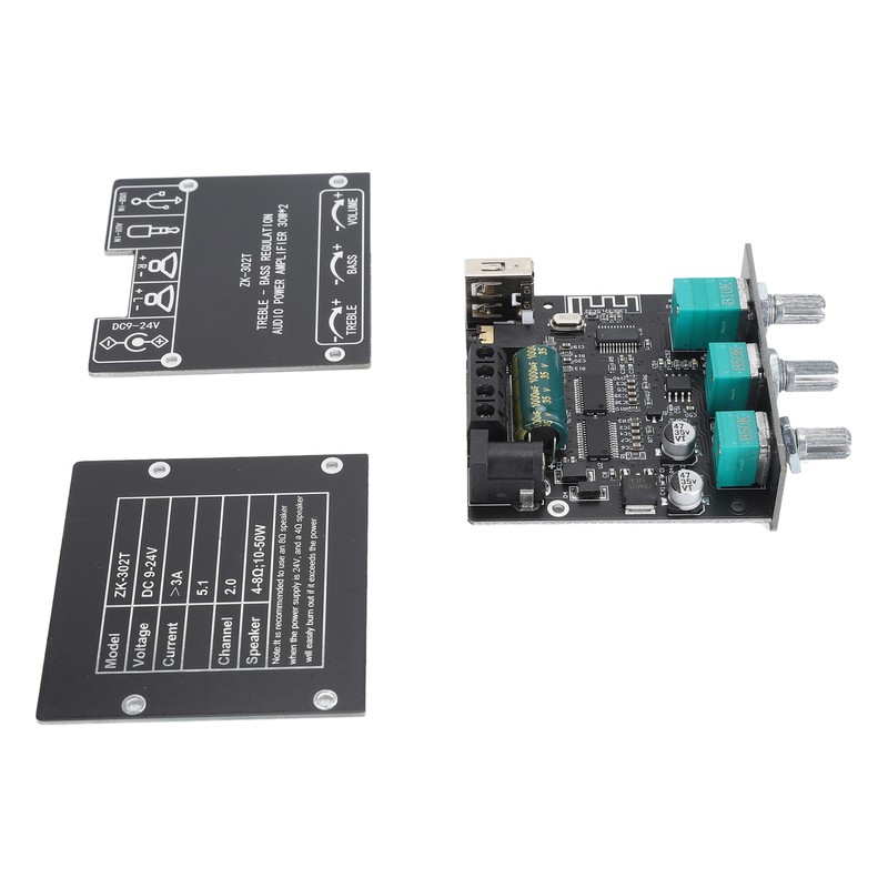 1、HIGH POWER AND WIDE VOLTAGE: ZK 302T as a compact 2.0 channel bluetooth amplifier board with small size and many functions. Its peak power (PMPO) is up to 30W plus 30W and 9‑24V wide voltage input. 2、MULTIPLE INPUT MODES: Input modes include Bluetooth, AUX and USB sound card, USB flash drive modes, which can be connected to playback devices such as cell phones, tablets, CD players, computers, USB flash drives and more. 3、TREBLE AND BASS CONTROLS: Bluetooth power amplifier board is designed with control knobs for treble and bass, stereo dual channel output for a more layered sound and more powerful bass. 4、APP FUNCTION: By downloading the dedicated APP, you can make in depth settings for the amp board through the mobile APP, such as customizing the bluetooth name, setting the bluetooth passcode, turning on, off the prompt sound and so on. 5、APP FUNCTION FOR ANDROID PHONES ONLY: At present, the APP function is only applicable to for Android cell phones, if your cell phone is not an for Android phone, you will not be able to use the APP function.